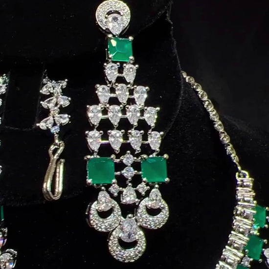 Green and silver American Diamond Jewelry Set inlcuding Tikka.